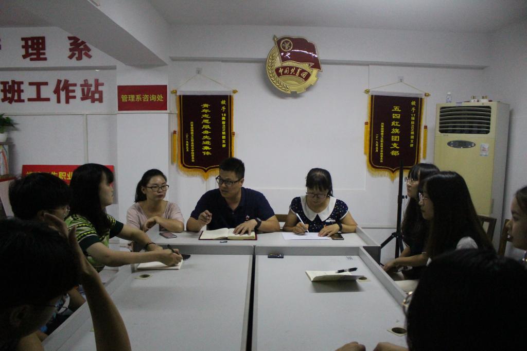 為加強(qiáng)我系團(tuán)學(xué)組織建設(shè),加強(qiáng)團(tuán)學(xué)干部工作凝聚力。管理系黨總支艾松軍書(shū)記、專(zhuān)職組織員張?jiān)葡祭蠋煛F(tuán)總支書(shū)記馮瑞華老師于2019年9月26日晚7:00-8:30開(kāi)展團(tuán)學(xué)工作調(diào)研會(huì)議。
