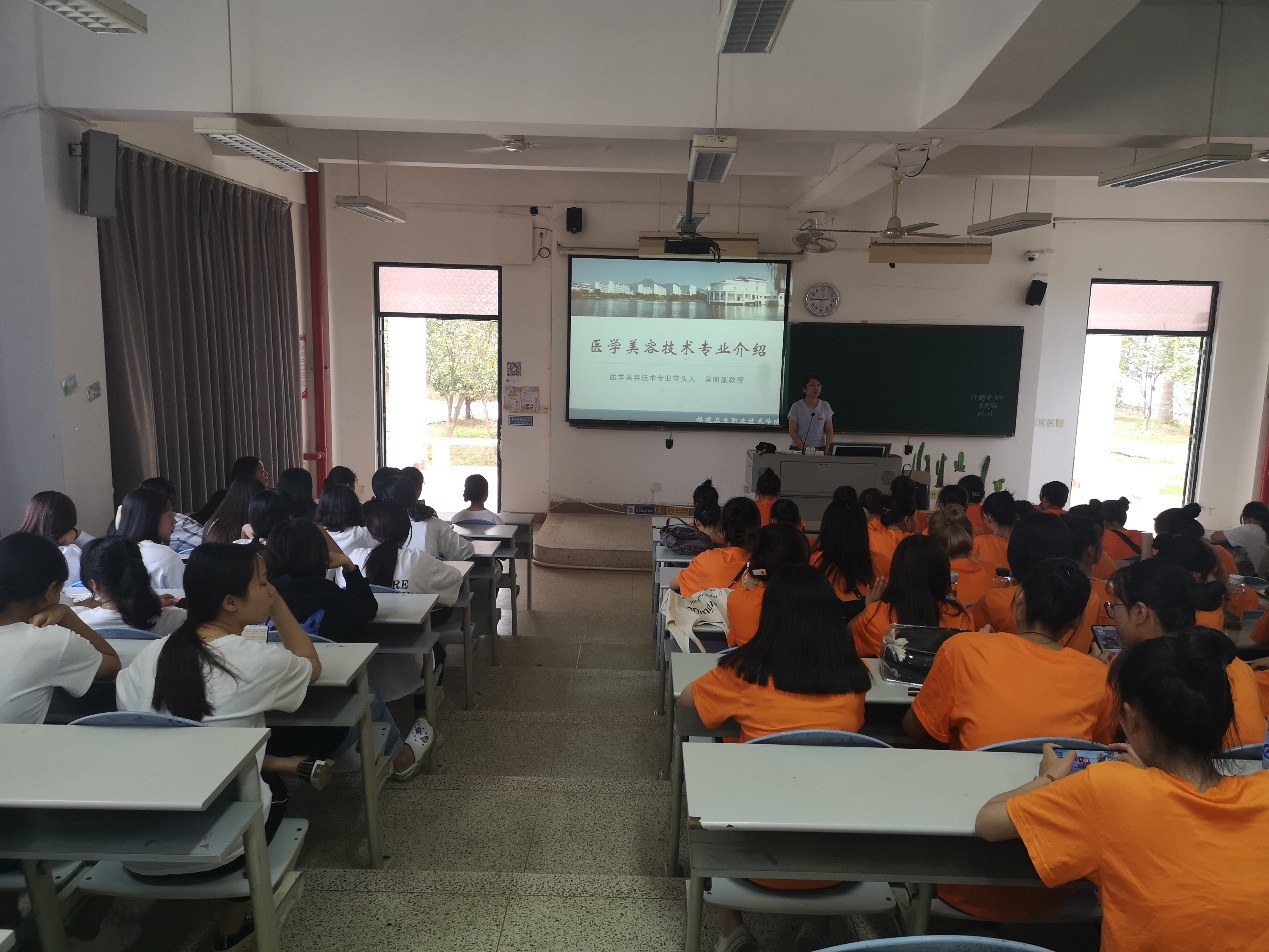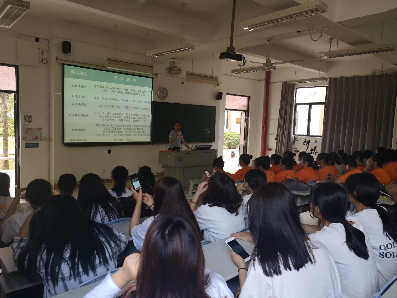 2019年10月17日下午,為了提升高職一年級新生對自己所學專業的了解,我校醫學美容技術專業學科帶頭人吳明老師給2019級醫學美容技術專業新生進行專業介紹,同時參會的還有醫學美容與中醫養生教研室主任楊笑老師和專任教師李芳琴老師。吳明老師主要從專業簡介、培養目標、課程設置、師資力量、就業方向、可考取的資格證以及歷屆醫學美容技術專業獲獎情況等方面介紹了醫學美容技術專業,詳細說明了專業的發展特色與方向。吳明老師對新生們提出幾點希望:希望同學們在學習期間,能有堅定的理想信念,努力把專業課程學好,夯實基礎;同時希望同學們能在未來的學習生活中積極參加專業相關的比賽,努力成為技術精湛的高技術人才。最后的答疑解惑環節,同學們積極地提出對未來學習方向的問題和見解。