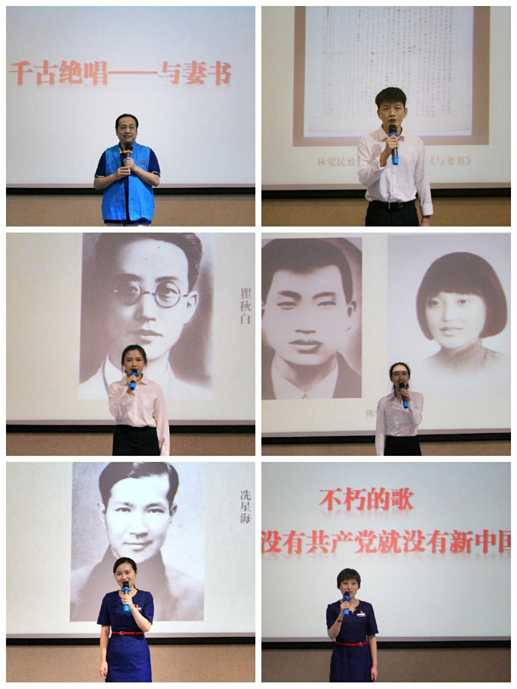 宣講團(tuán)以1840年鴉片戰(zhàn)爭以來,為中華民族的獨(dú)立自由、抵御外侮和偉大復(fù)興做出巨大貢獻(xiàn)的英雄兒女的感人事跡為題材,從無數(shù)感人至深的革命先驅(qū)的事跡中,擷取了“黃花崗 72 烈士之一”的林覺民的《與妻書》、陳覺和趙云霄所寫的兩封感人至深的遺書、《國際歌》的中文翻譯者瞿秋白、《黃河大合唱》的譜曲者——冼星海、《沒有共產(chǎn)黨就沒有新中國》的創(chuàng)作者曹火星的五段故事,通過緬懷英烈,回望中國共產(chǎn)黨走過的光輝歷程,激勵(lì)和教育廣大黨員。整場宣講會(huì)形式新穎,聲情并茂,極具感染力,深深吸引了在場的師生。