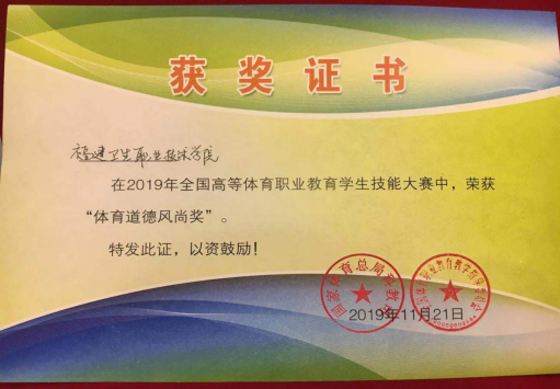 2019年11月22日,全國高等體育職業(yè)教育學(xué)生技能大賽在美麗的海濱城市珠海落下帷幕,我院健康管理系體育保健與康復(fù)專業(yè)3名選手組成代表隊榮獲“體育道德風(fēng)尚獎”。參賽選手18級體育保健與康復(fù)專業(yè)301班楊浩、鄭鳳龍、劉雪琴榮獲“健身指導(dǎo)技能”比賽團體三等獎。