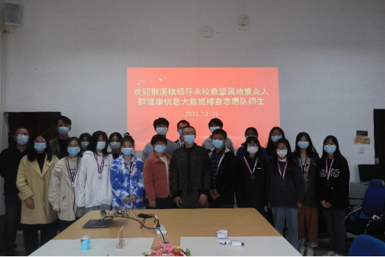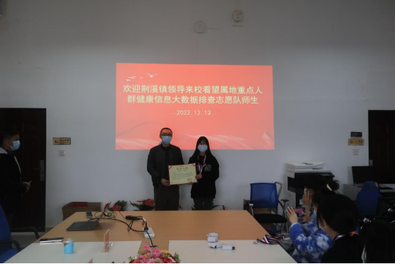 2022年12月13日荊溪鎮(zhèn)政府陳文碩副鎮(zhèn)長(zhǎng)來(lái)我校看望屬地重點(diǎn)人群健康信息大數(shù)據(jù)排查志愿隊(duì)師生并給志愿隊(duì)師生頒發(fā)獎(jiǎng)狀。