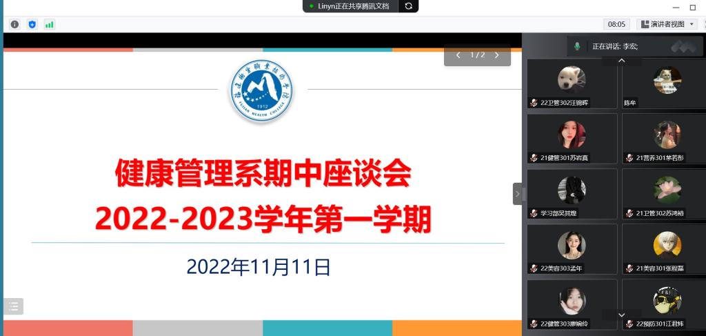為了解我系師生在校的學習生活狀況以及遇到的實際問題,充分落實以學生為本、全面發展的理念,2022年11月11日中午12時40分,健康管理系通過線上騰訊會議形式召開了2022-2023學年第一學期期中教學座談會,參與本次會議活動的有校督導李冬秀老師、何旭春老師,健康管理系副主任李宏老師、各教研室教師以及各班學生代表。