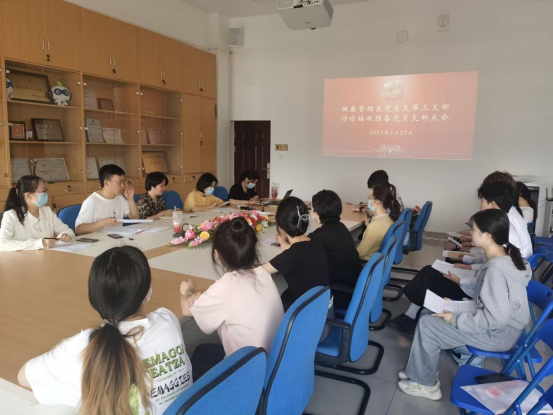 5月25日,健康管理系黨總支第三支部于圖書館五樓會議室召開接收預備黨員大會,會議就曾學華等6名發展對象入黨問題展開了充分討論,黨支部書記王開曄同志主持會議。