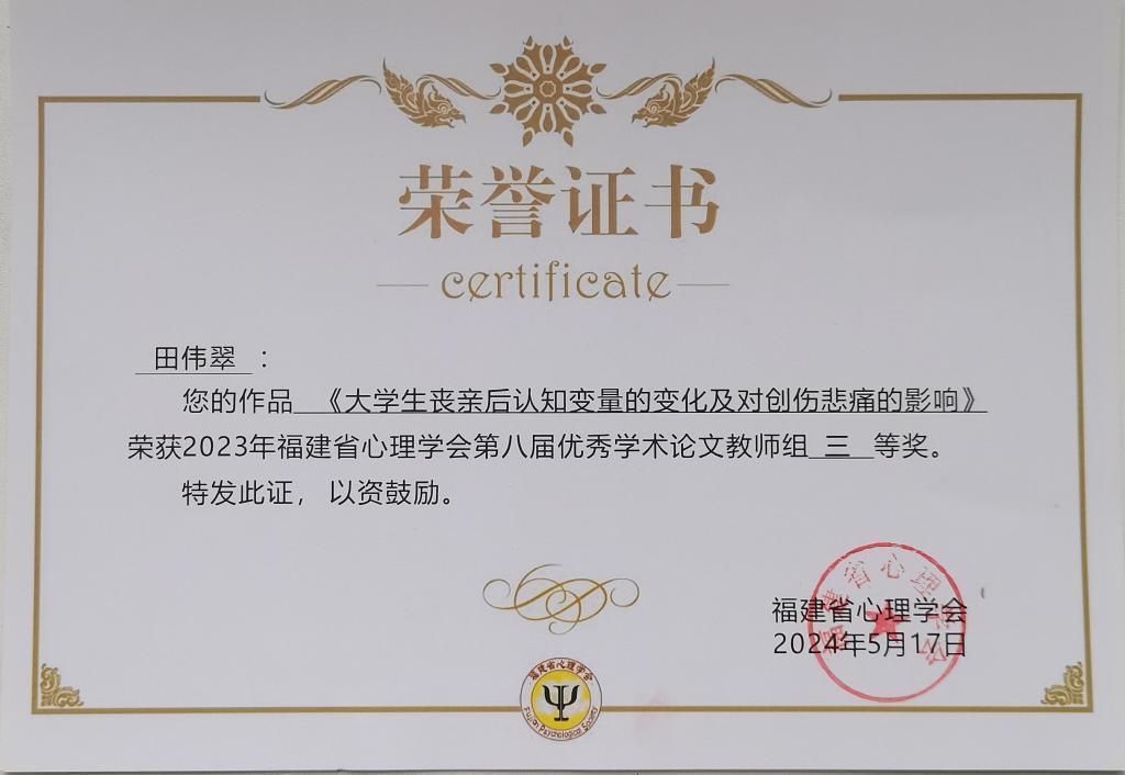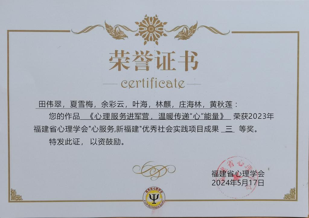 近日,福建省心理學會關于2023年“心服務,新福建”優秀社會實踐項目成果和第八屆優秀學術論文評選落下帷幕。經福建省心理學會理事專家評審、常務理事會和理事會審議,我校公共衛生與健康管理學院報送的社會實踐項目成果《心理服務進軍營,溫暖傳遞“心”能量》榮獲優秀社會實踐項目成果三等獎;田偉翠老師報送的學術論文《大學生喪親后認知變量的變化及對創傷悲痛的影響》榮獲第八屆優秀學術論文教師組三等獎。