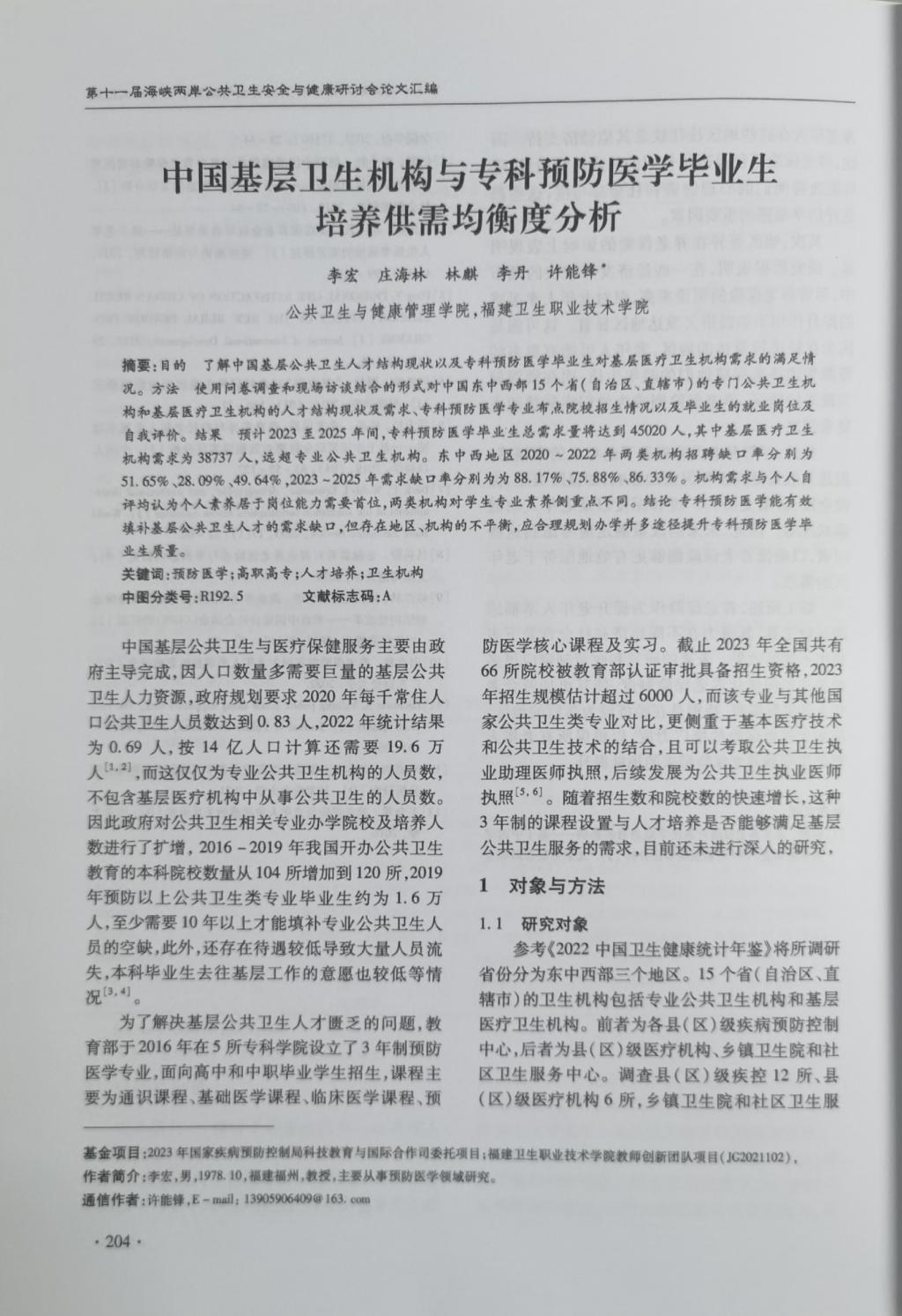 2023年我校作為全國(guó)衛(wèi)生健康職業(yè)教育教學(xué)指導(dǎo)委員會(huì)預(yù)防醫(yī)學(xué)分專業(yè)委員會(huì)主任單位,接受國(guó)家疾控局委托開展了《專科層次疾病防控人員培養(yǎng)、使用與需求研究》的全國(guó)調(diào)研圓滿驗(yàn)收通過,許能鋒教授以該項(xiàng)目數(shù)據(jù)為依據(jù)撰寫的論文成果《中國(guó)基層衛(wèi)生機(jī)構(gòu)與專科預(yù)防醫(yī)學(xué)畢業(yè)生培養(yǎng)供需均衡度分析》投稿本次會(huì)議,得到了相關(guān)領(lǐng)導(dǎo)的高度肯定,入選了會(huì)議論文交流并編入會(huì)議論文匯編,同時(shí)李宏、林麒老師以論文作者參加了此次會(huì)議。
