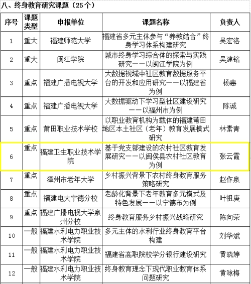 根據《福建省教育廳福建省財政廳關于開展2018-2020年福建省終身教育重點項目建設工作的通知》(閩教職成〔2018〕36號)文件精神,我系教師黨員張云霞老師積極申報2019年課題項目,所主持的《基于黨支部建設的農村社區教育發展研究——以閩侯縣農村社區教育為例》課題于近日入選第二批全省終身教育研究重點課題,特此祝賀!