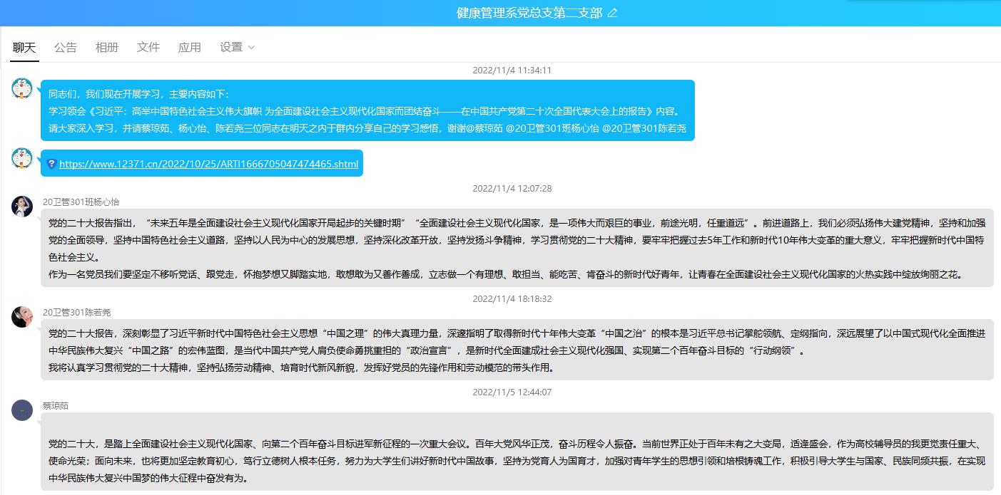 為深入宣傳貫徹黨的二十大精神,2022年11月4日健康管理系黨總支第二支部召開學習黨的二十大報告學習分享會議,會議在線上舉行,會議由支部書記張凱捷主持。