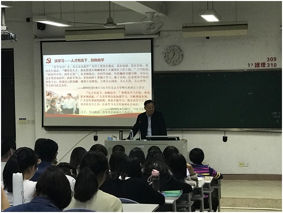 2018年4月10號,曾武祈書記走進(jìn)思政課堂,為我系學(xué)生講授以“征程新時代 召喚新青年 勇?lián)率姑睘橹黝}的形勢政策課。