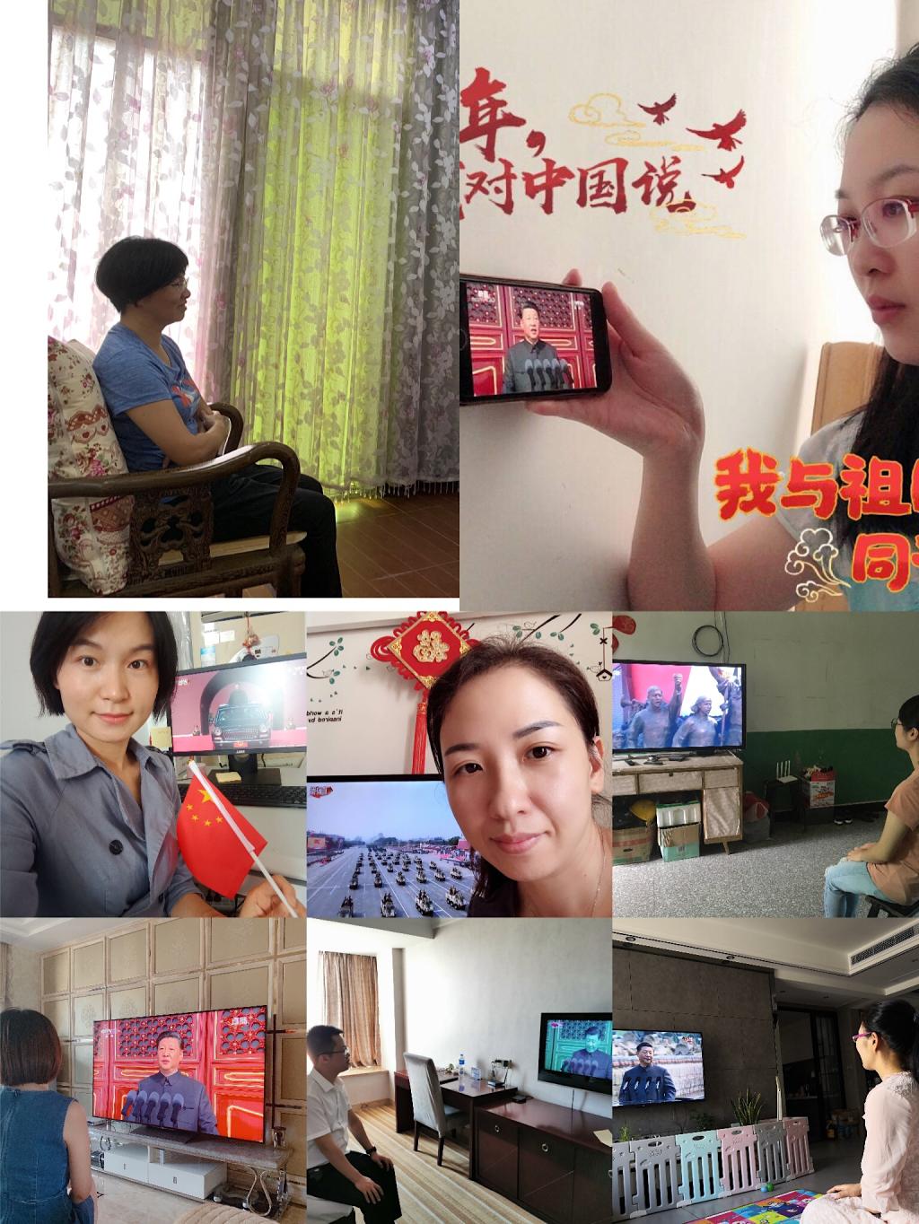 同學(xué)們也時(shí)刻關(guān)注著慶祝大會(huì)。留校的同學(xué)在宿舍觀看慶祝大會(huì),返家途中的同學(xué)們?cè)趽頂D的車上也時(shí)刻關(guān)注著慶祝大會(huì)的盛況。
