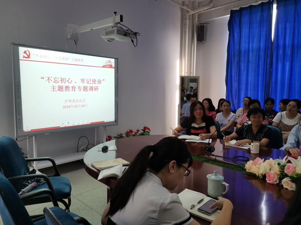 為深入貫徹落實習近平總書記在“不忘初心、牢記使命”主題教育工作會議上的重要講話精神,堅持把調查研究貫穿主題教育始終,與學習教育、檢視問題、整改落實同步推進。2019年10月10日,學院黨委副書記、巡回指導三小組組長李美華帶領學院團委書記黃曦到護理系開展“不忘初心、牢記使命”主題教育調研會,并就“教師聘任制改革、團學改革”等問題分別召開了教師調研會和學生代表調研會。