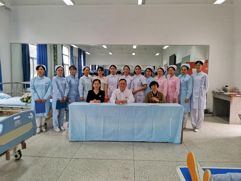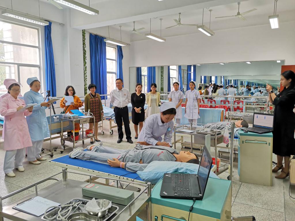 11月7日,學院黨委曾武祈書記在護理系黨總支謝濤書記、護理系龔海蓉副主任的陪同下再一次來到護理系實訓室訓練現場看望慰問正在備戰全省護理職業技能大賽的精準扶貧班參賽選手。