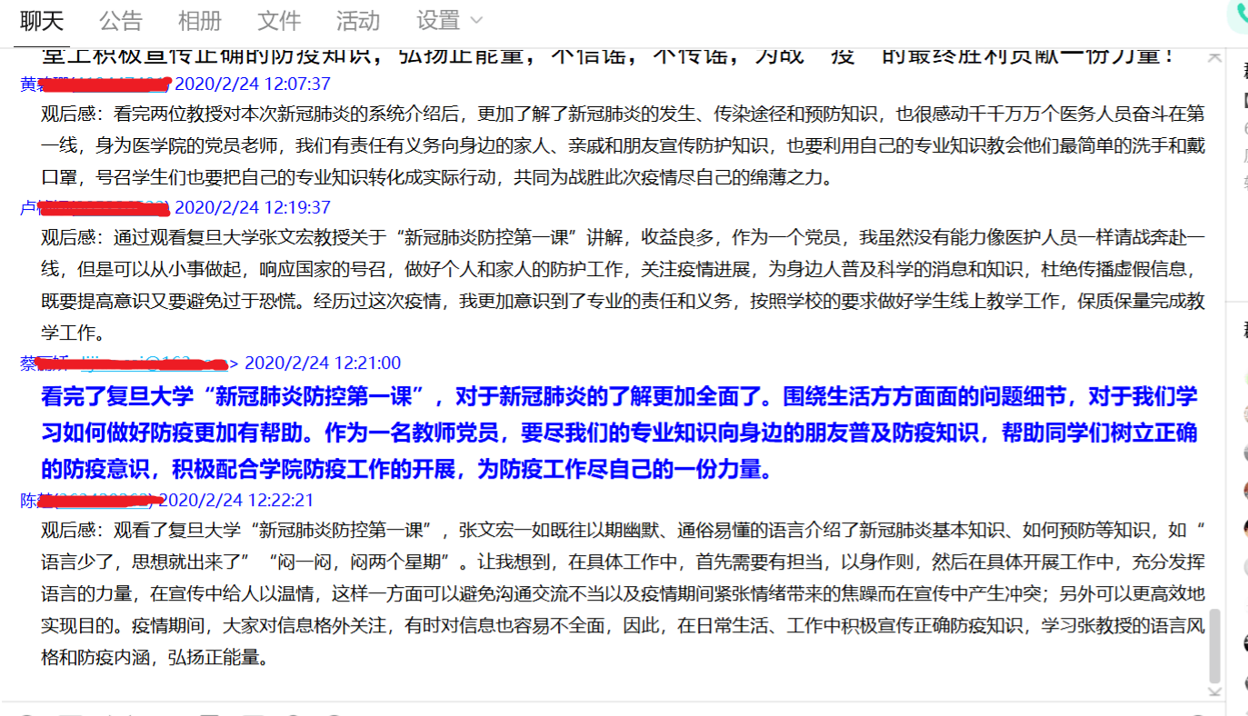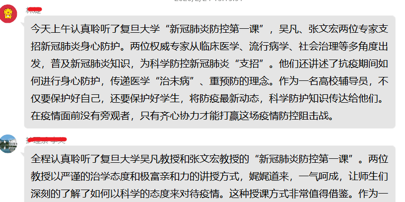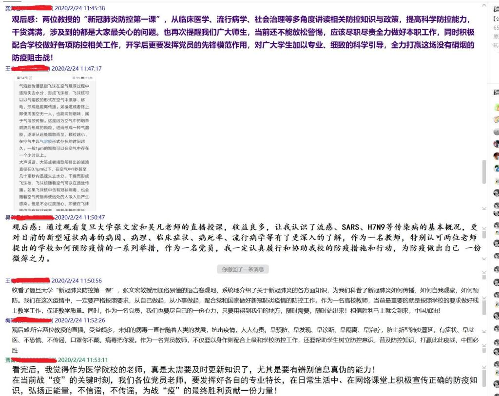 2020年2月24日上午,護理系全體師生在線觀看了復旦大學“新冠肺炎防控第一課”網絡直播課,線上聆聽“疾控女俠”吳凡和“硬核教授”張文宏兩位專家講述“新冠肺炎防控第一課”。線上聆聽完兩位專家的講授,護理系黨總支馬上組織黨員師生對“新冠肺炎防控第一課”進行線上學習研討。黨員同志們針對今天的學習紛紛發表了各自的體會,收獲頗豐。