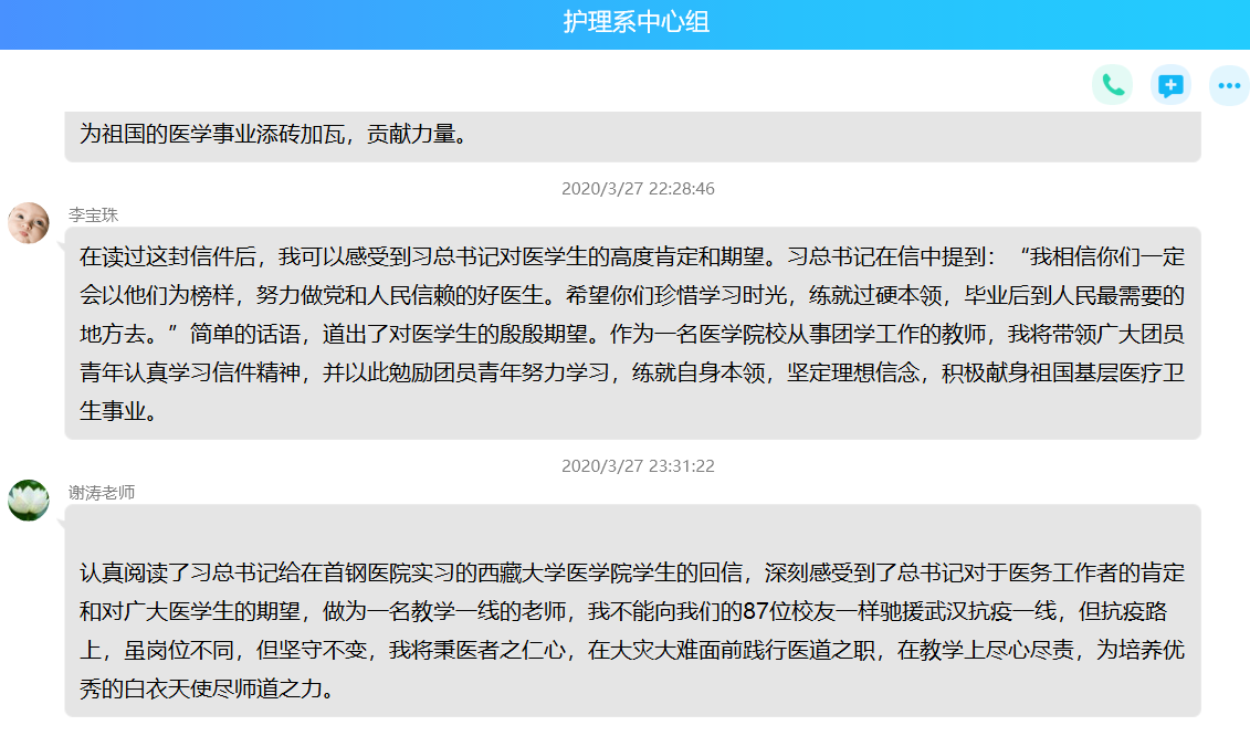 王憲寧同志表示,仔細閱讀了習近平總書記給在首鋼醫院實習的西藏大學醫學院學生的回信,我感受到作為一名醫學工作者的光榮與自豪,同時也感覺到了肩上的重擔。我們不僅是醫學工作者,更是未來白衣天使的培養人,而這次的新冠疫情,我們也驕傲地看到眾多我校的畢業生奔赴抗疫一線,與病毒英勇斗爭,守護人民的健康。作為一名護理專業教師,我們的責任是立足本職,教書育人,使學生具備扎實的理論基礎和過硬的技能本領,將來能成為一名優秀的白衣天使,為祖國的醫學事業添磚加瓦,貢獻力量。