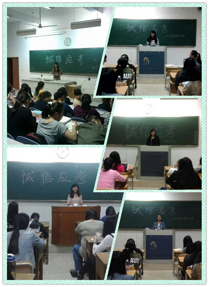 每個班級都宣讀了誠信應考倡議書,由學習委員組織學習《學生違紀處理規定》中有關考試紀律規定、考試違紀作弊行為的認定,讓同學銘記考試規章制度,嚴格要求自己。輔導員強調了遵守考試紀律的重要性及其處分結果的嚴重性。班會結束后,各個班級都組織學生進行承諾誠信應考簽名活動,通過簽名表明自己誠信應考的決心。