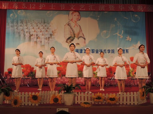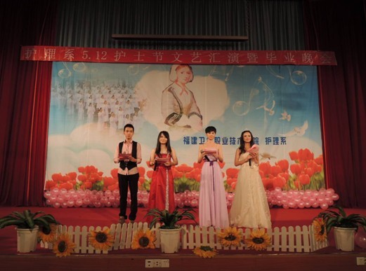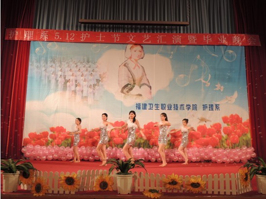 福建衛生職業技術學院護理系于2013年5月7日晚7:00在學術廳迎來了5.12護士節文藝匯演暨畢業晚會。院黨委陳雄副書記、黃開良副院長、魏立娜副院長、學生工作處黃銘珊處長、護理系黨總支謝濤書記、院團委宋維副書記及各系團總支書記、老師、輔導員蒞臨了本次晚會。