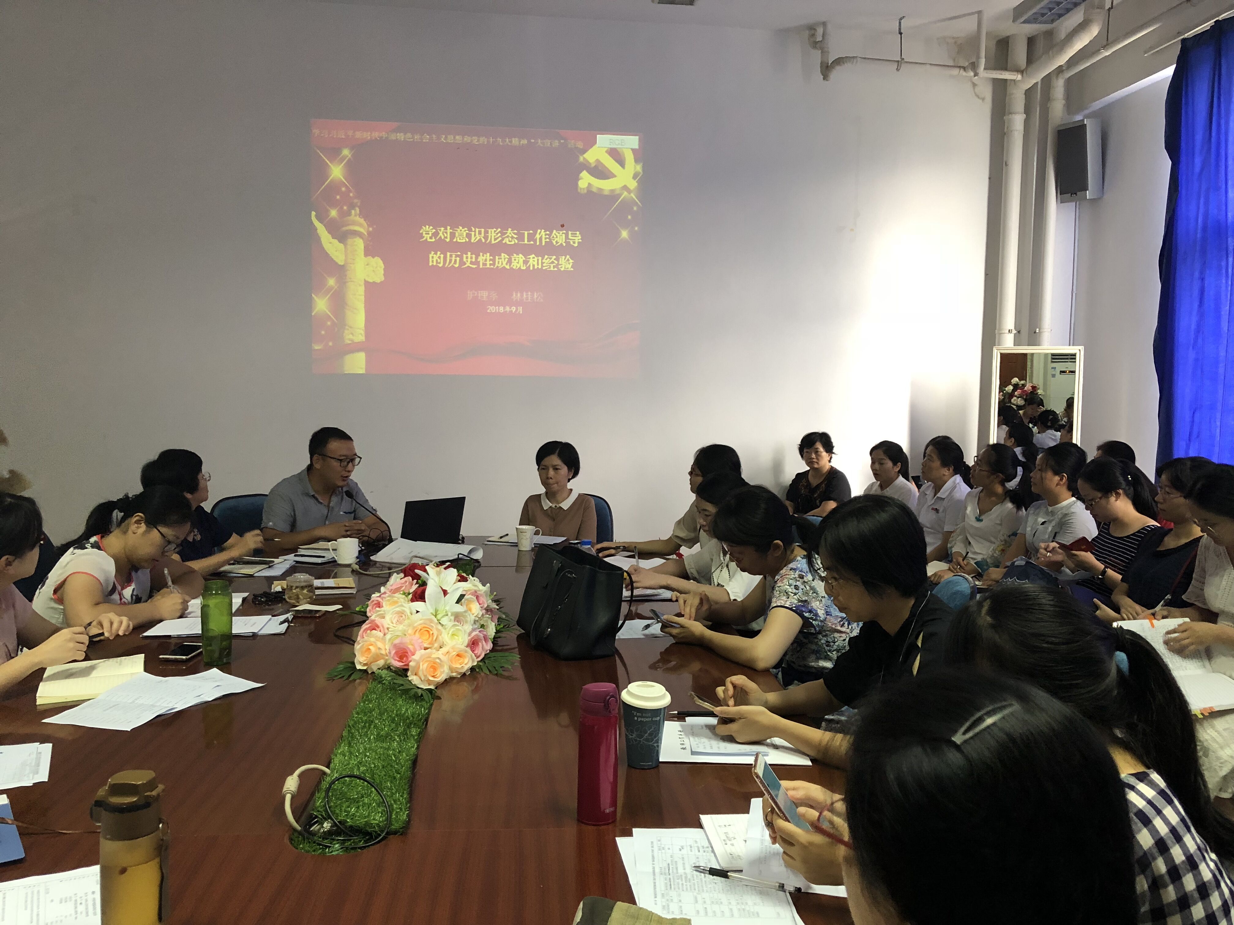 為深入學習貫徹習近平新時代中國特色社會主義思想和黨的十九大精神,按照學院《開展習近平新時代中國特色社會主義思想“大宣講”工作方案》的要求與安排,9月13日下午,護理系在301會議室舉辦專題黨課,護理系林桂松副書記為護理系全體黨員干部職工做了以“黨對意識形態工作領導的歷史成就和經驗”為專題的黨課,護理系全體教職工認真聽取的黨課。