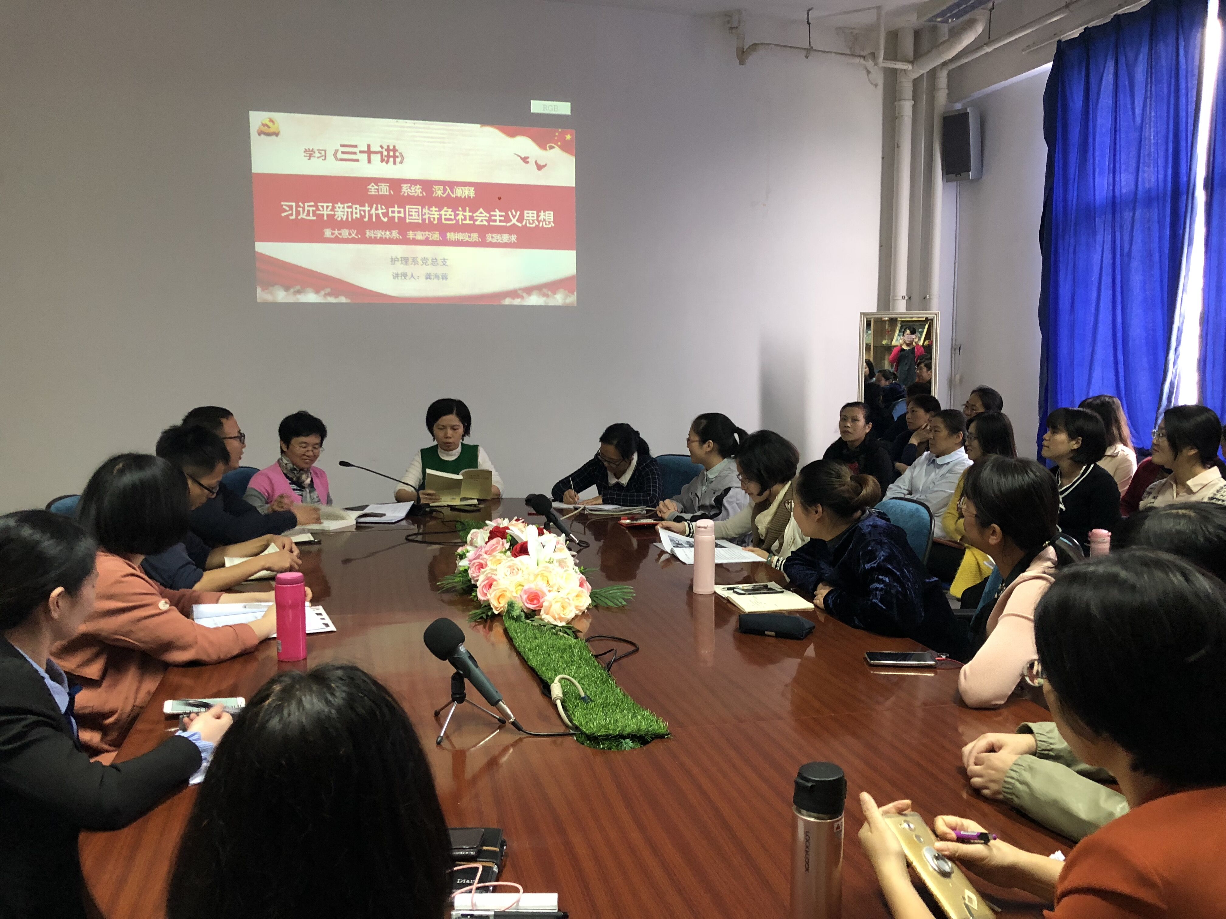 為深入貫徹落實習近平新時代中國特色社會主義思想和黨的十九大精神,2018年10月18日下午,護理系在301會議室集中學習了《習近平新時代中國特色社會主義思想三十講》的第一講,護理系龔海蓉副主任主持并講授,護理系全體教職工參加集中學習。