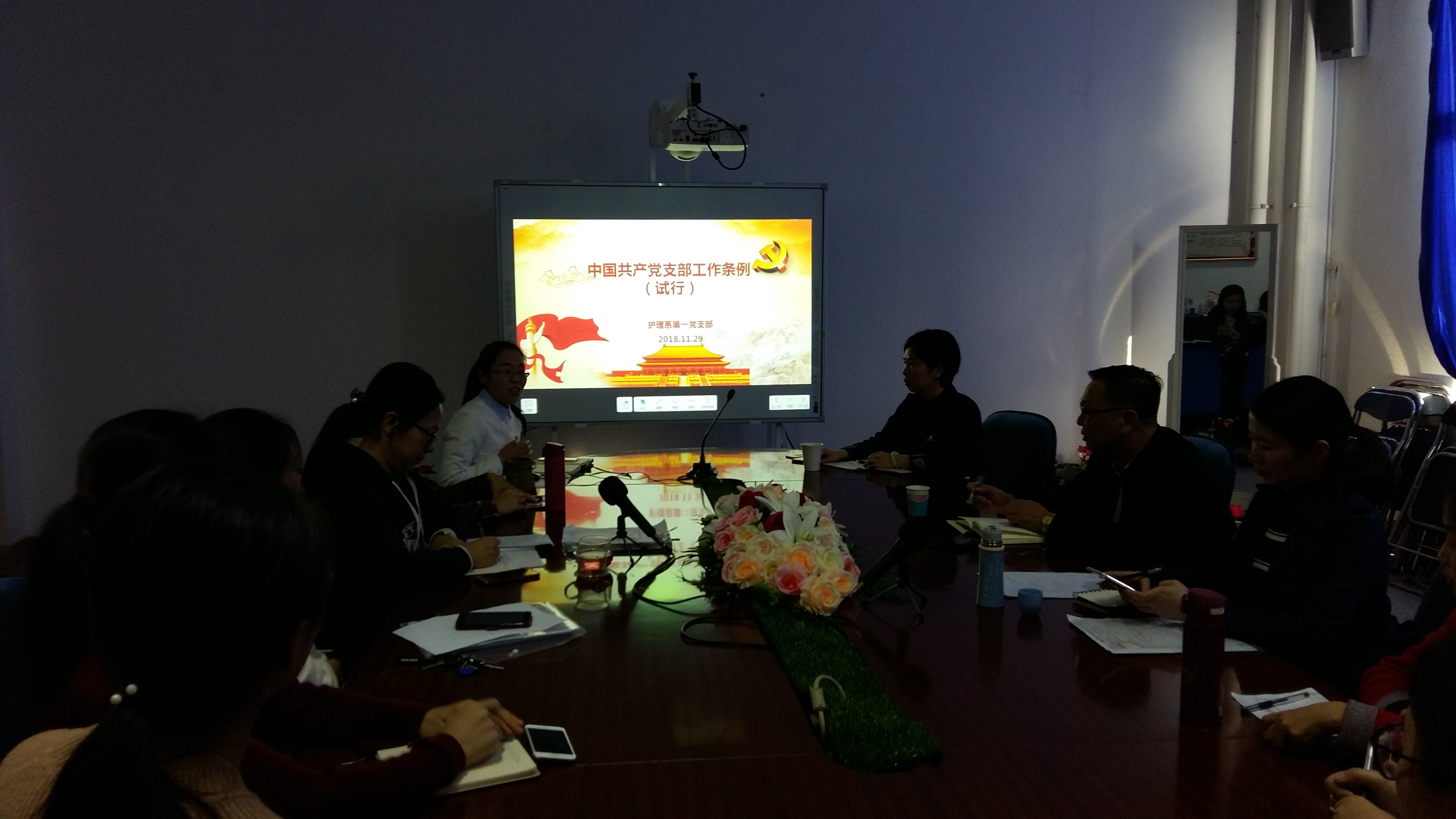 近日,中共中央印發了《中國共產黨支部工作條例(試行)》(以下簡稱《條例》)。護理系第一黨支部于2018年11月29日召開支部黨員大會,組織全體黨員對《條例》進行了學習,學院黨委書記曾武祈同志以護理系第一黨支部普通黨員的身份參加了學習。