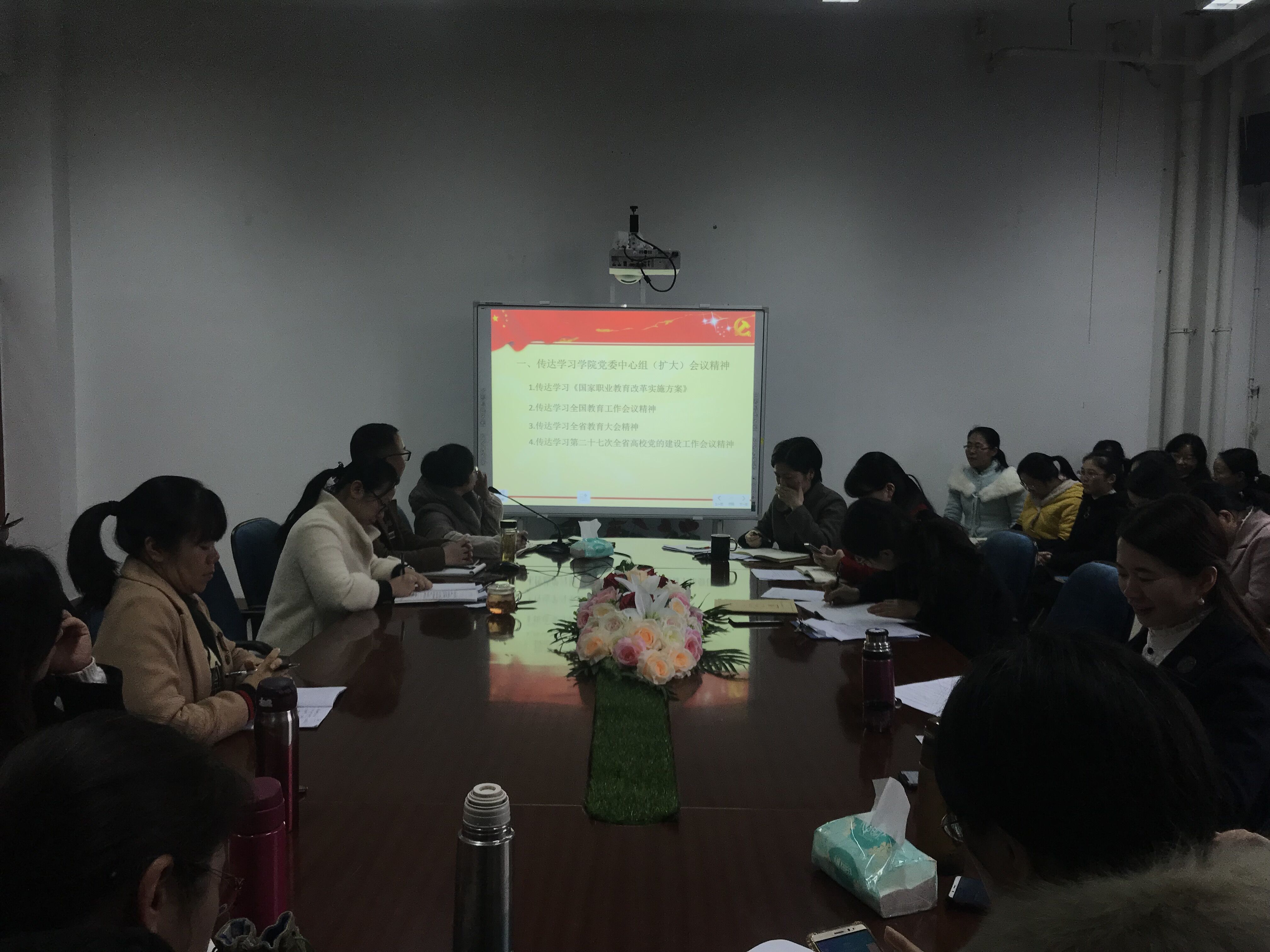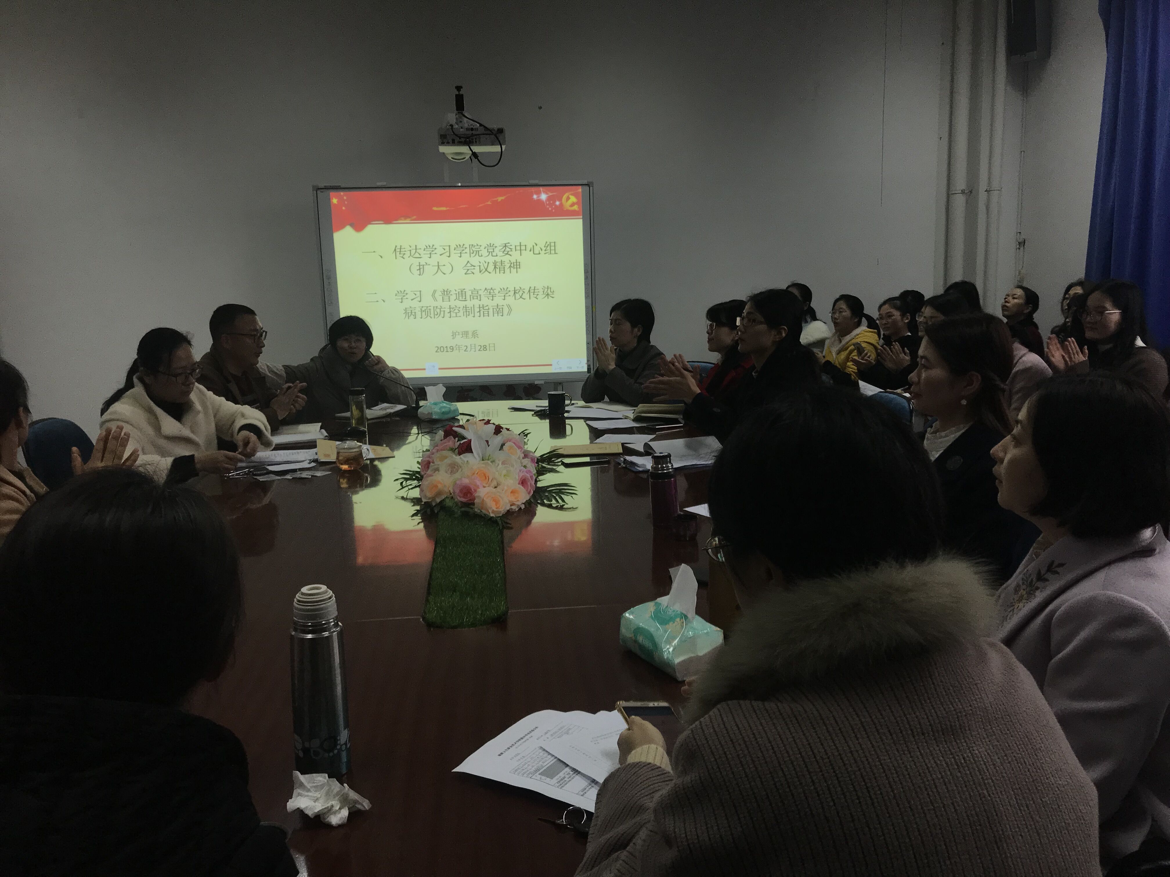 2019年2月28日,護(hù)理系組織全體教職員工于護(hù)理系301會(huì)議室學(xué)習(xí)學(xué)院黨委中心組(擴(kuò)大)會(huì)議精神及《普通高等學(xué)校傳染病預(yù)防控制指南》。會(huì)議由護(hù)理系黨總支謝濤書記主持。