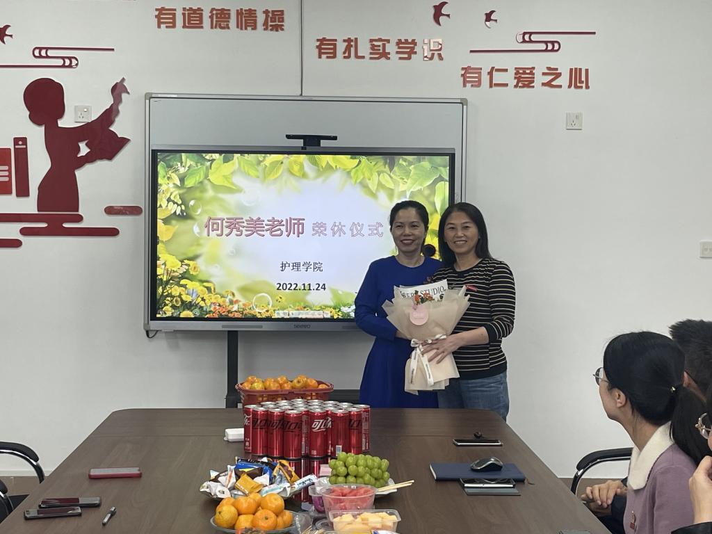 11月24日下午,護理學院301會議室涌動著溫情的氣氛。護理學院全體領導班子、各教研室教師代表、實訓中心全體教師齊聚一堂,為光榮退休的何秀美老師舉行歡送會。