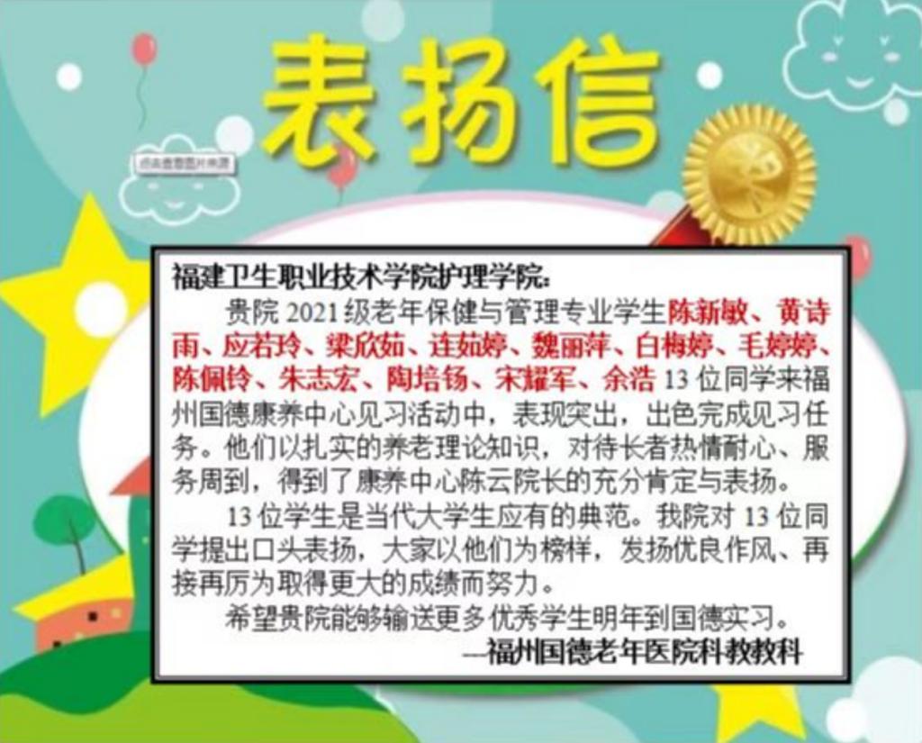 近期,完成教學見習的21老年保健與管理301班部分學生收到了來自見習單位福州國德老年醫院的表揚信。這是對該專業學生見習期間活動表現的肯定,也是對我校該專業辦學的鼓勵!