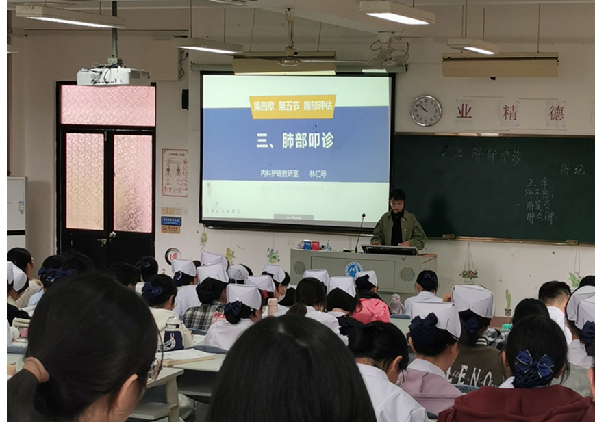 為踐行黨的二十大報告提出的建設高質量教育體系和關注教師隊伍建設,不斷提升青年教師教學水平,展示青年教師的自我風采,護理學院內科護理教研室教師林仁琴于4月6日上午開設了《健康評估》校級公開課,為22級護理專業學生講授“肺部叩診”內容。學校質量管理辦公室主任郭禮堅攜校級督導對該堂公開課進行評議、護理學院副院長林浩、王憲寧和各院系多位教師參與聽課。