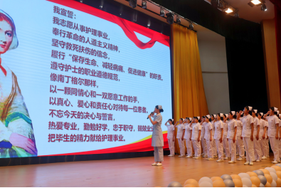 授帽儀式結束后,護理學院內科護理教研室老師林雅珠帶領學生在這神圣時刻許下誓言,同學們舉起右手,鏗鏘誓言指引學生用崇高的信仰建起生命的方舟,用錚錚誓言表達不辱白衣天使神圣使命的決心。