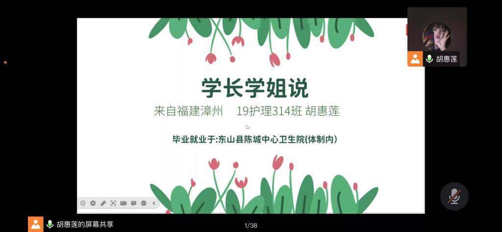 4月21日晚,黨支部邀請了15屆畢業生蘭秀芳(就職于閩侯縣醫院)、22屆畢業生胡惠蓮(就職于東山縣陳城中心衛生院)兩位校友開展“學長學姐說就業經驗分享”,旨在鼓勵引導護理學子面向基層醫療單位就業。同時,也邀請已經就業轉實習的20級老年保健與管理專業的吳泳冰同學一起分享她在養老院的就業心得。