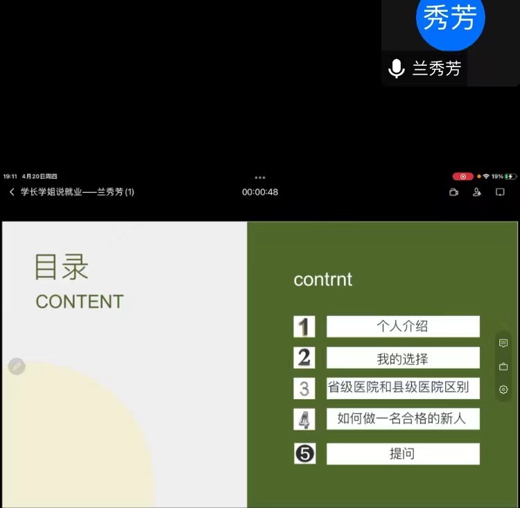 蘭秀芳校友分享她從福州市一醫院編制內護士辭職,到閩侯縣醫院工作的經歷,以實際經歷向同學們展示了基層就業的廣闊前景。