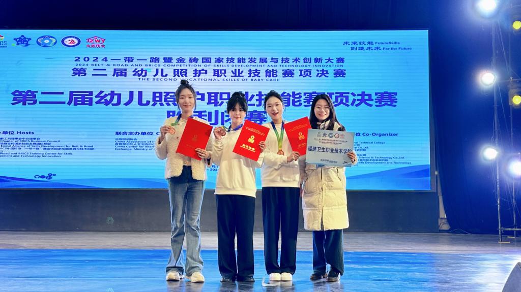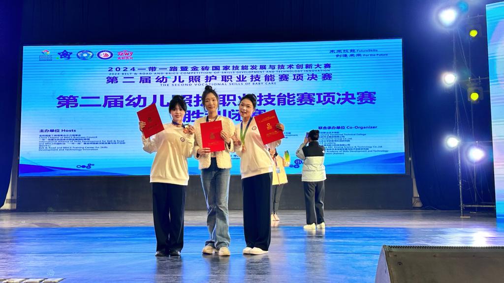 12月7日至10日,2024“一帶一路”暨金磚國(guó)家技能發(fā)展與技術(shù)創(chuàng)新大賽第二屆幼兒照護(hù)職業(yè)技能賽項(xiàng)決賽在岳陽(yáng)職業(yè)技術(shù)學(xué)院順利舉行。本次大賽有1500余名選手報(bào)名參賽,通過(guò)11場(chǎng)區(qū)域選拔賽,最終,來(lái)自全國(guó)30個(gè)省份、直轄市和自治區(qū)164所院校的320余名選手晉級(jí)賽項(xiàng)決賽。我校護(hù)理學(xué)院選派的2名嬰幼兒托育服務(wù)與管理專(zhuān)業(yè)學(xué)生陳萱萱、斯夢(mèng)婷,榮獲高職組團(tuán)隊(duì)三等獎(jiǎng);李馨老師獲教師組三等獎(jiǎng)。