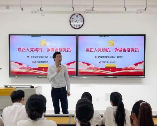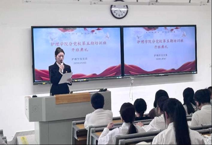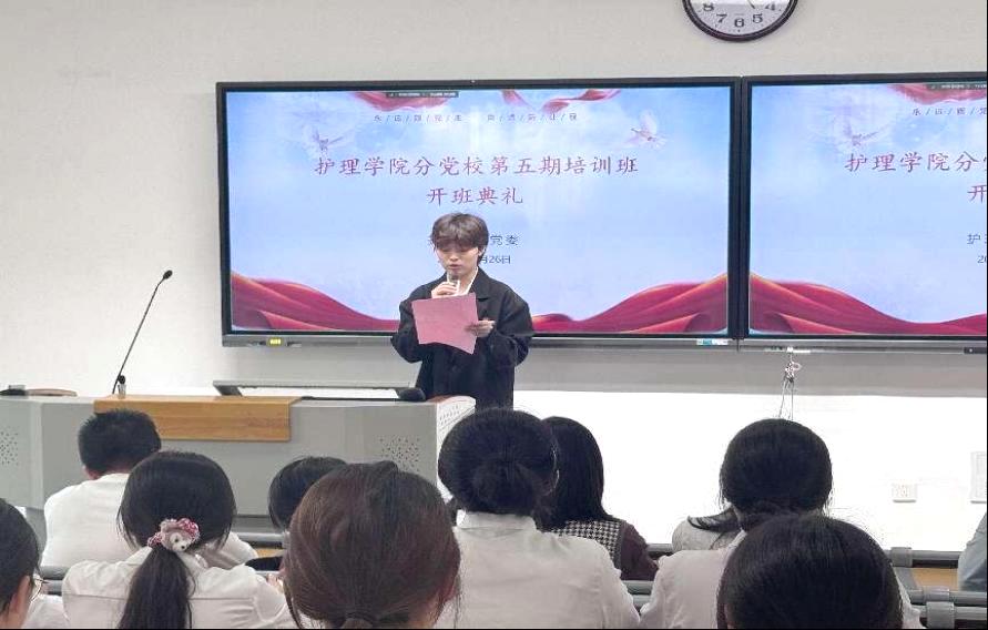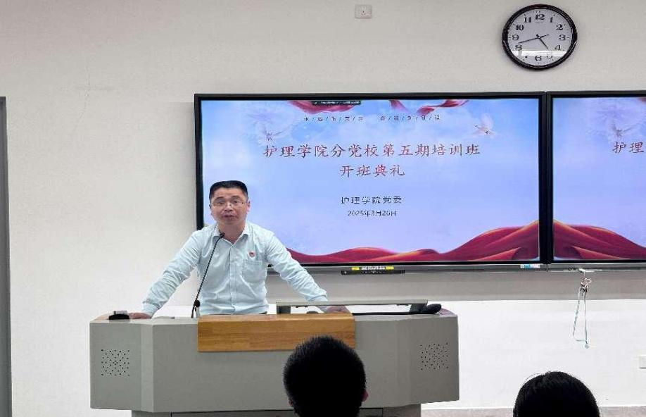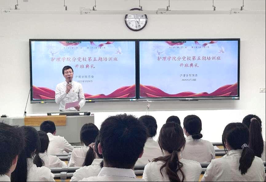 為深入學習貫徹習近平新時代中國特色社會主義思想,切實加強入黨積極分子的教育培養。2025年3月27日,護理學院分黨校第五期入黨積極分子培訓班開班典禮在護理學院第五階梯教室隆重舉行。黨委領導班子、黨支部書記、團總支指導老師與60名入黨積極分子出席開班典禮。