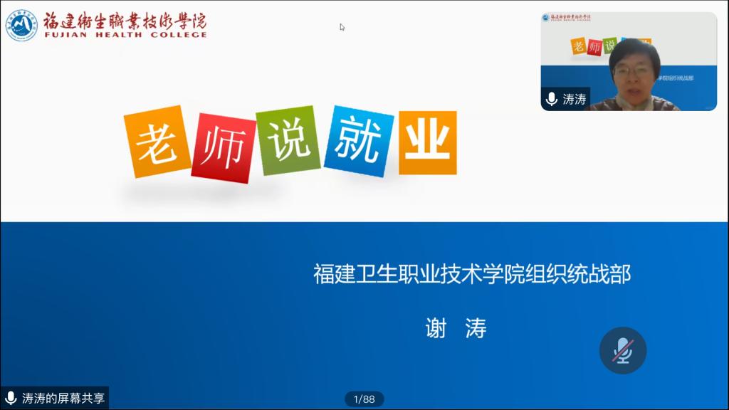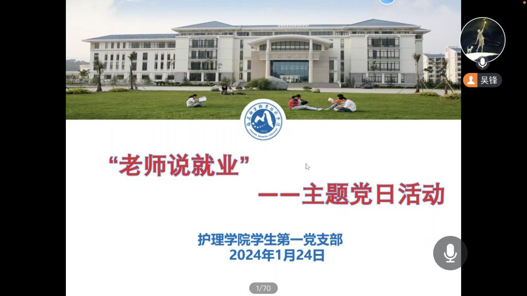 為貫徹落實(shí)全國、全省2024屆普通高校畢業(yè)生就業(yè)創(chuàng)業(yè)工作會議精神,幫助畢業(yè)生高質(zhì)量充分就業(yè),切實(shí)發(fā)揮黨建引領(lǐng)作用,聚焦解決學(xué)生“急難愁盼”問題,1 月24 日,護(hù)理學(xué)院學(xué)生第一黨支部線上開展“老師說就業(yè)”主題黨日活動,本次講座邀請到原護(hù)理學(xué)院黨總支書記、現(xiàn)任校黨委組織統(tǒng)戰(zhàn)部部長謝濤為護(hù)理學(xué)院2024屆畢業(yè)生做專題分享,學(xué)生第一黨支部書記吳鋒主持會議,護(hù)理學(xué)院270多位同學(xué)線上聆聽。