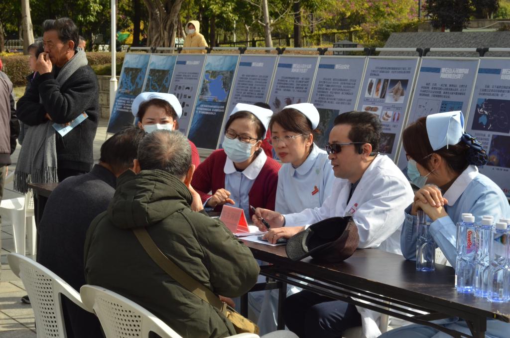 在活動現場,護理學院第二黨支部帶領師生向現場居民發放抗癌防癌健康宣傳知識手冊,為居民們宣講肺癌、食管癌、乳腺癌等常見癌癥防治的科學知識和預防措施,并針對這些常見癌癥的病因、癥狀和早期發現方法進行具體分析,鼓勵帶病居民樂觀積極面對疾病。