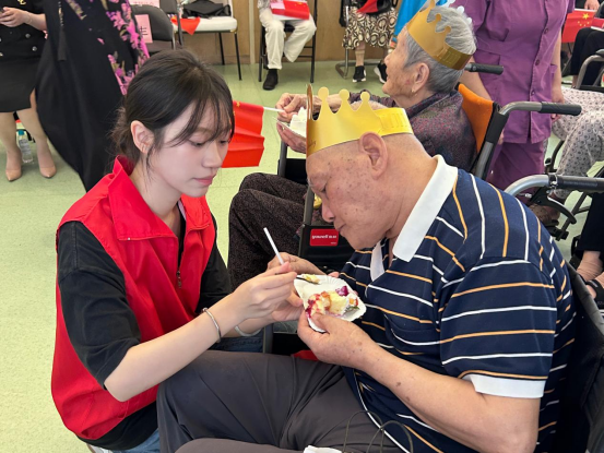 隨后,活動進入了溫馨感人的慶生環節。在歡快的生日歌聲中,幾位即將迎來生日的爺爺奶奶被請上臺,院長親自推著精心準備的生日蛋糕緩緩步入舞臺中央。在大家的祝福聲中,爺爺奶奶們許下心愿,幸福地吹滅了蠟燭。志愿者與老師細心地將蛋糕分發給每一位老人,甜蜜的滋味在舌尖綻放,更在心頭蕩漾。
