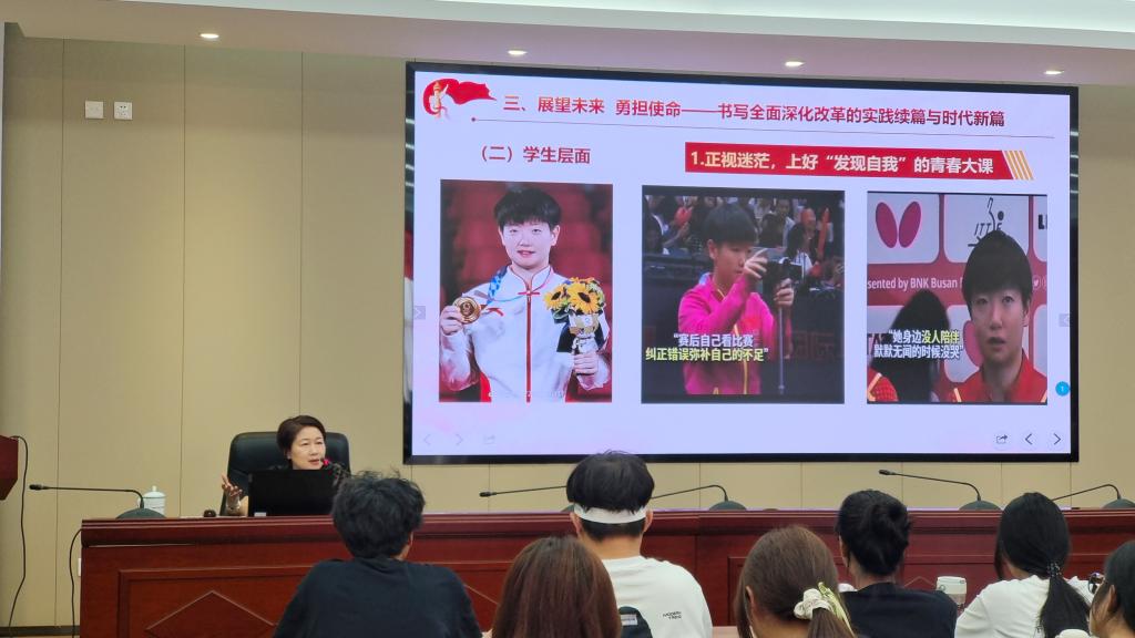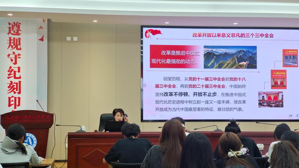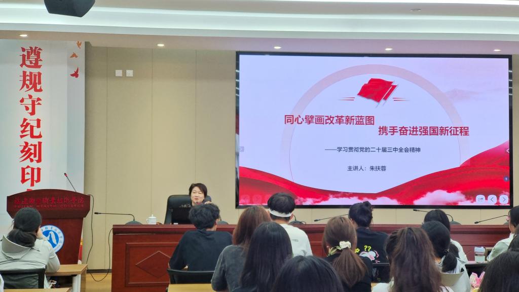9月13日下午,校黨委委員朱扶蓉以“同心擘畫改革新藍圖 攜手奮進強國新征程”為題,走進24護理307、308班為我校師生專題宣講黨的二十屆三中全會精神暨秋季開學第一課。
