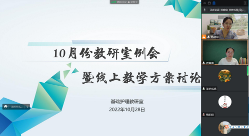 按照校領導的囑托,護理學院不斷調整優化線上授課準備工作,基礎護理教研室全體老師在騰訊會議上召開 “互助共享,提高線上實訓教學有效性”線上教學方案討論會。大家結合以往線上實訓教學存在的問題進行交流、積極反思、各抒己見,針對實操課用物場地受限和師生互動受影響兩大突出問題,老師們群策群力,共同研討解決問題的方案,通過靈活調整教學進度,直播時開啟攝像頭、連麥互動等方式保證教學效果。