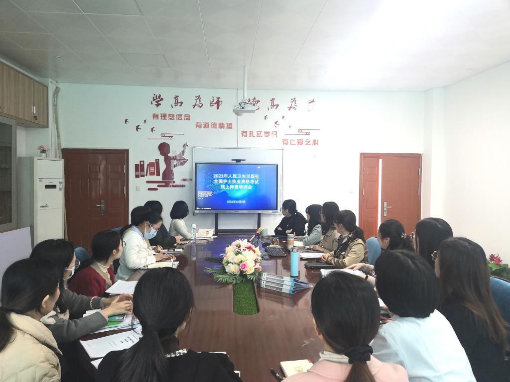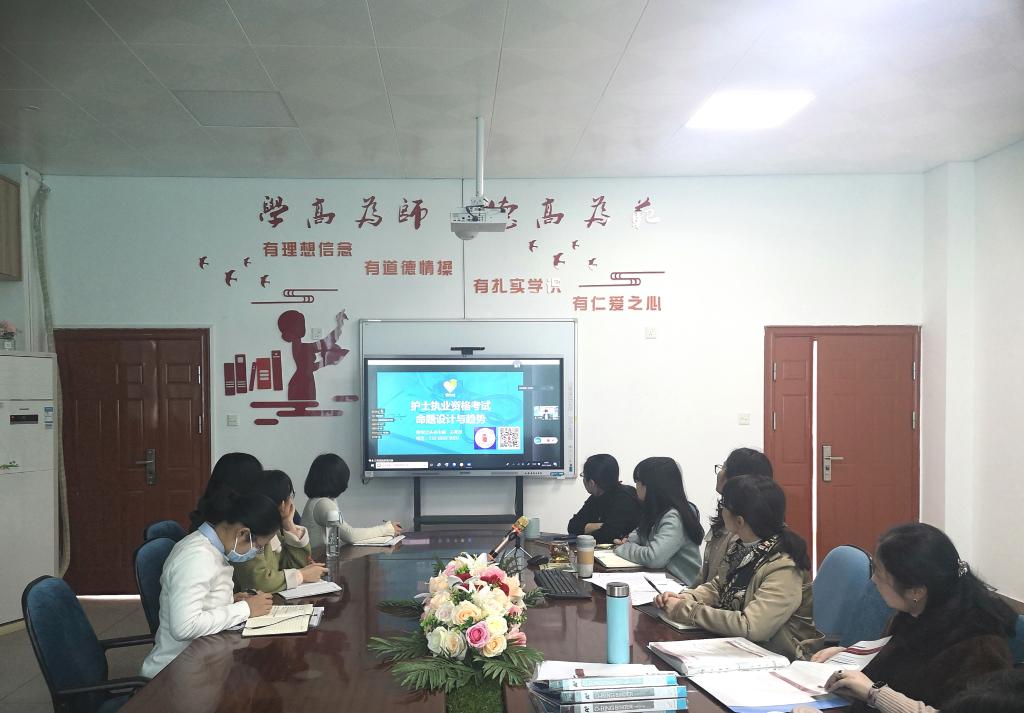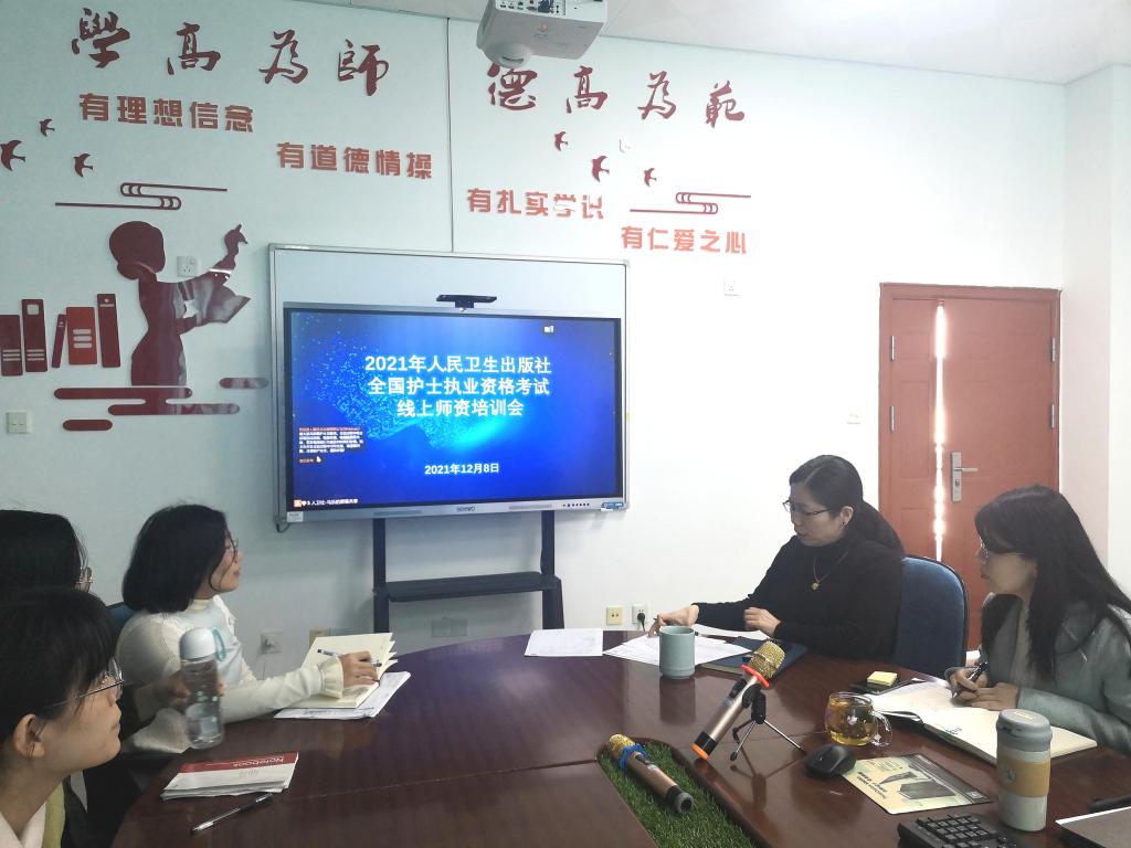 為進一步提高護理學院學生護士執業資格考試通過率,同時提升護考輔導教師的培訓水平和教學能力,12月8日,人民衛生出版社舉辦2021年全國護士職業資格考試線上師資培訓會,護理學院教師在會議室參加了本次線上培訓會。