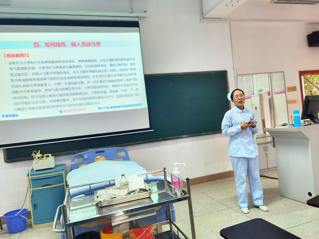 此次活動(dòng)由賈箐箐老師主講,賈老師闡述了本次集體備課的四個(gè)主要內(nèi)容:低氧血癥的分度、如何調(diào)節(jié)吸痰負(fù)壓、吸痰手法及順序、如何提煉并融入思政元素,并且拓展了經(jīng)口鼻吸痰的禁忌癥和并發(fā)癥的內(nèi)容。