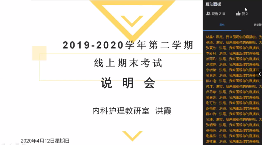 為使考生對“考生須知”有進(jìn)一步清晰認(rèn)識,2020年4月12日晚,洪霞書記帶領(lǐng)向月、張璟、陳婷玉等黨員老師分別以釘釘直播方式面向16級五年專和18級三年專護(hù)理、助產(chǎn)專業(yè)的校內(nèi)外共計35個行政教學(xué)班的全體師生開展一場別開生面的“2019-2020學(xué)年第二學(xué)期線上期末考試說明會”。直播活動分為解析和答疑兩個環(huán)節(jié),黨員教師們從考試時間、考試形式、考試題型及考試注意事項等方面對“考生須知”進(jìn)行深入淺出的解釋,耐心的針對學(xué)生的疑問一一進(jìn)行精準(zhǔn)答疑,每個直播現(xiàn)場師生互動氣氛活躍,從7點(diǎn)30分一直持續(xù)10點(diǎn)30分,同學(xué)們還意猶未盡。通過本次線上直播,學(xué)生對即將來臨的線上期末考試的考試要求有了深刻認(rèn)識,并將以嚴(yán)肅認(rèn)真的態(tài)度對待本次期末考試。