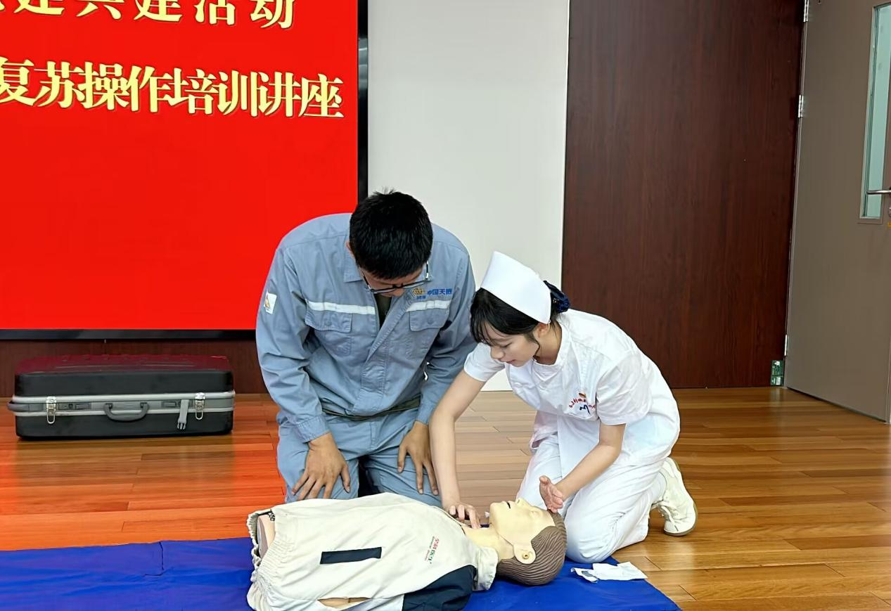 在主任醫(yī)師們精彩的講解之后,福建衛(wèi)生職業(yè)技術(shù)學(xué)院護(hù)理學(xué)院“夢飛天使”志愿服務(wù)隊的隊員們給中化學(xué)天辰(泉州)新材料有限公司的職工們進(jìn)行了現(xiàn)場CPR的演示與教學(xué)。他們利用模擬人,生動形象地展示了整個 CPR 操作過程。