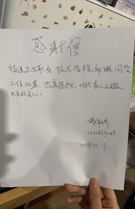 近日,護理學院22護理312班邱琳同學,在廈門大學附屬第一醫院腎內科實習期間,收到了住院患者的親筆感謝信。科室護士長及科室老師也對邱琳同學的護理工作給予了高度認可。