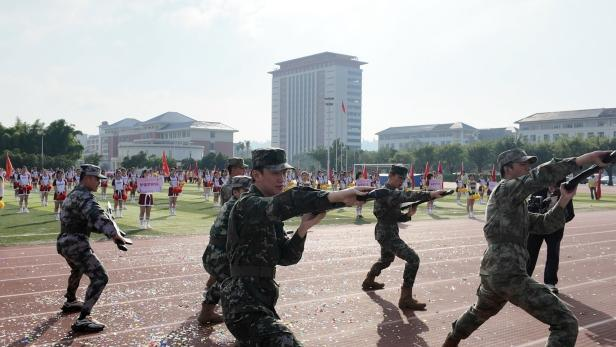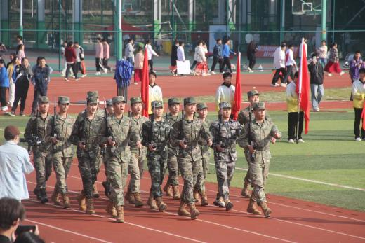 一群身著迷彩服的退伍學子英姿颯爽地步入會場