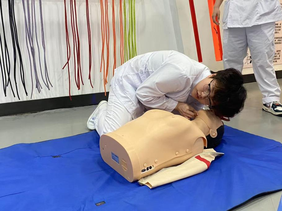 第二環節急救包扎與CPR技能操作練習于4月20日—21日在紅十字會生命教育體驗學堂進行,同學們動作嫻熟,用著螺旋反折法處理“手臂傷口”,指尖壓緊繃帶起點,每繞一圈便精準翻折一次,繃帶邊緣整齊如尺量,最后仔細調整松緊度后交予工作人員檢查指導,同時在CPR區的同學在標準進行30次連貫的胸外按壓后,立即托起“傷員”下頜,捏住鼻子,吹氣兩次,動作干凈利落。練習現場既緊張認真又充滿活力,同學們專注操作,默契配合,富含濃厚的學習氛圍。
