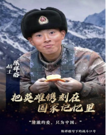 陳祥榕(2001.12-2020.6),中國人民解放軍某機步營站士。2020年6月在邊境沖突中,突入重圍,營救戰友,英勇戰斗,奮力反擊,毫不畏懼,直至壯烈犧牲。英雄雖已離去,精神永駐邊關。“清澈的愛,只為中國”這是18歲陳祥榕寫下的戰斗口號。