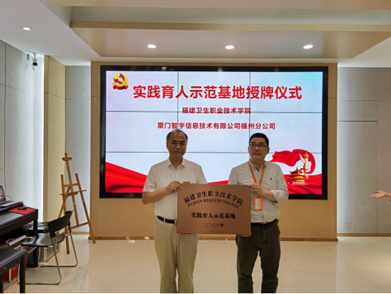 許能鋒代表學校向廈門智宇信息科技有限公司授予“福建衛生職業技術學院實踐育人示范基地”的牌匾