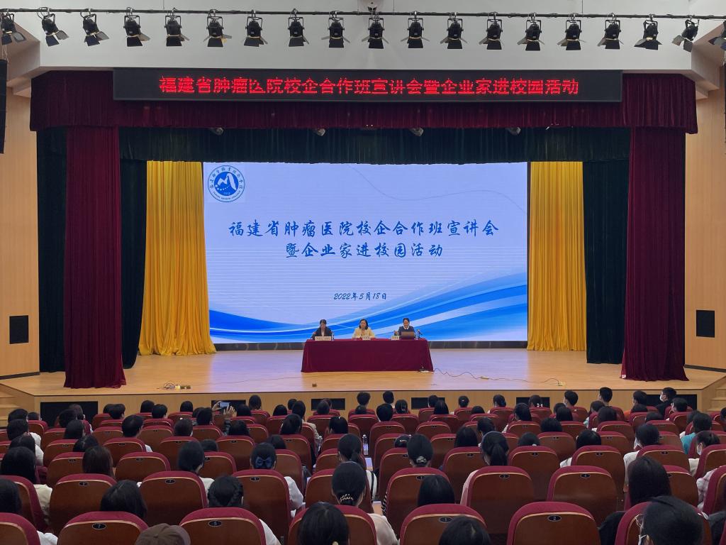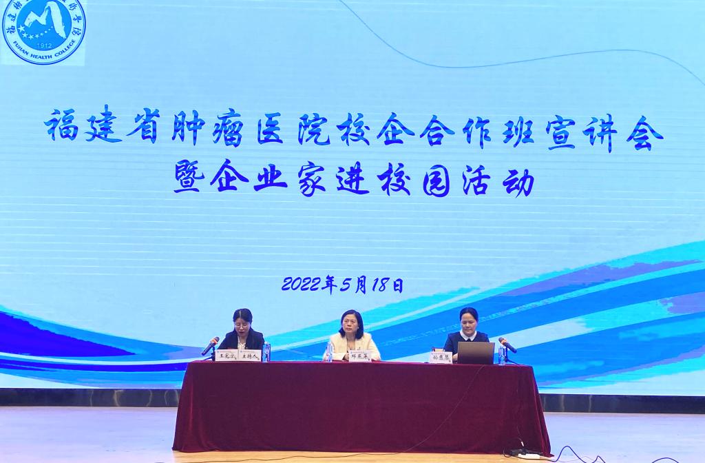會上,鄧燕萍介紹了福建省腫瘤醫院特色和優勢、就業前景、薪資待遇等情況;孫秀琴從校院合作班教學情況、師資隊伍、學生管理、業余生活等方面進行深入講解。