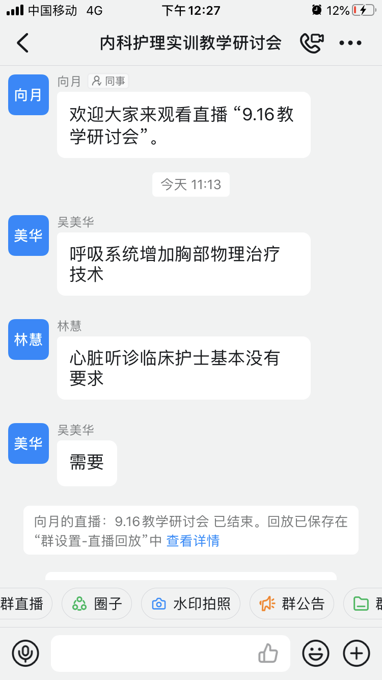 本次教學(xué)研討會(huì)對(duì)護(hù)理核心課程《急危重癥護(hù)理》的實(shí)訓(xùn)教學(xué)開(kāi)課情況、現(xiàn)狀及存在的問(wèn)題進(jìn)行梳理,問(wèn)診把脈,校內(nèi)和各家醫(yī)院的內(nèi)科護(hù)理教師們積極建言獻(xiàn)策,共同培養(yǎng)出新時(shí)代合格人才打下了牢固的基礎(chǔ)。
