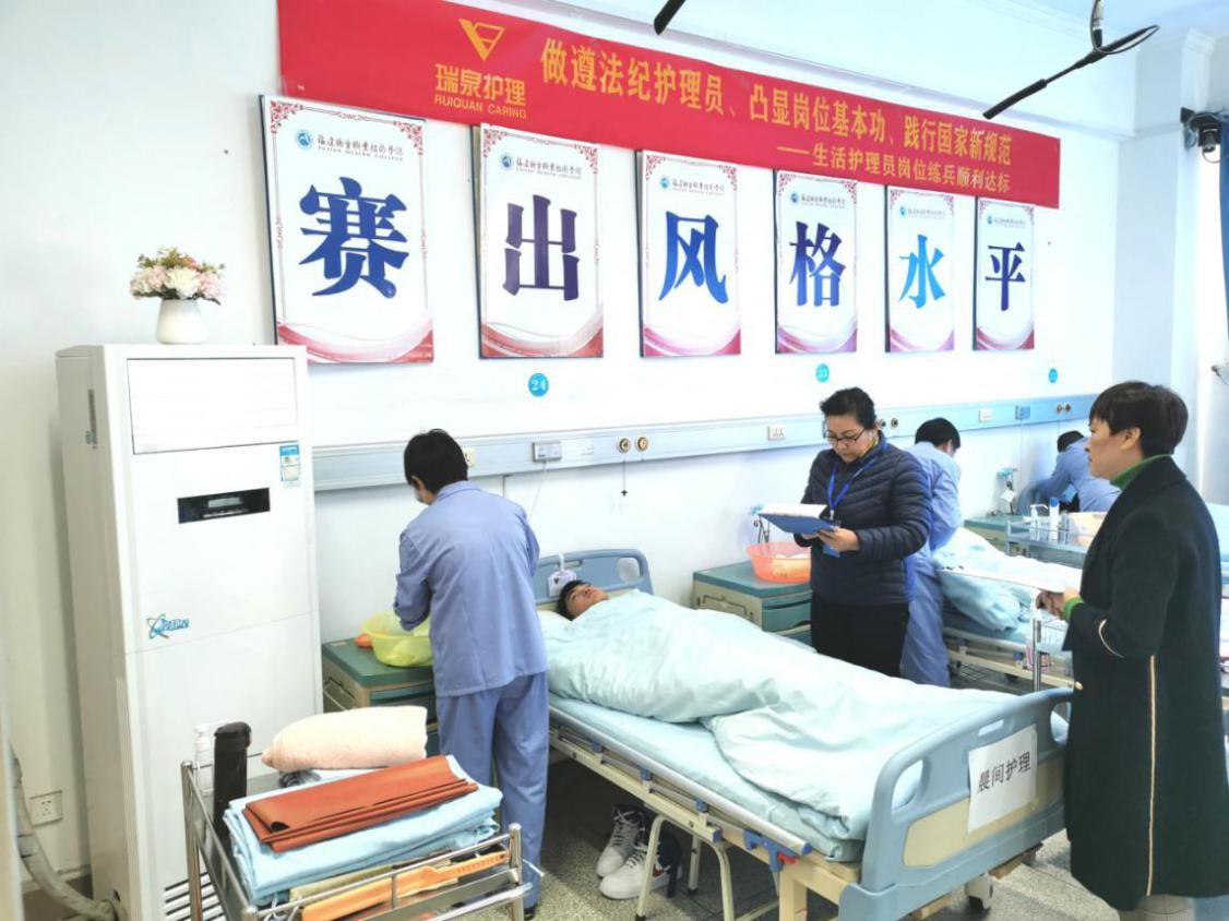 2019年12月8日,第五屆“瑞泉杯”生活護理崗位擂臺賽全省總決賽在我校成功舉辦。參加總決賽的23名選手是由全省各參賽醫(yī)院推薦,經(jīng)過層層選拔出來的優(yōu)秀護理員。比賽分組長組和普通護理員組,比賽內容分為理論和技能兩大部分,組長組比賽增加一項現(xiàn)場應答環(huán)節(jié),理論部分采取筆試考核方式,技能部分包括了輪椅運送技術、床上擦浴、晨間護理等5項生活護理技術。