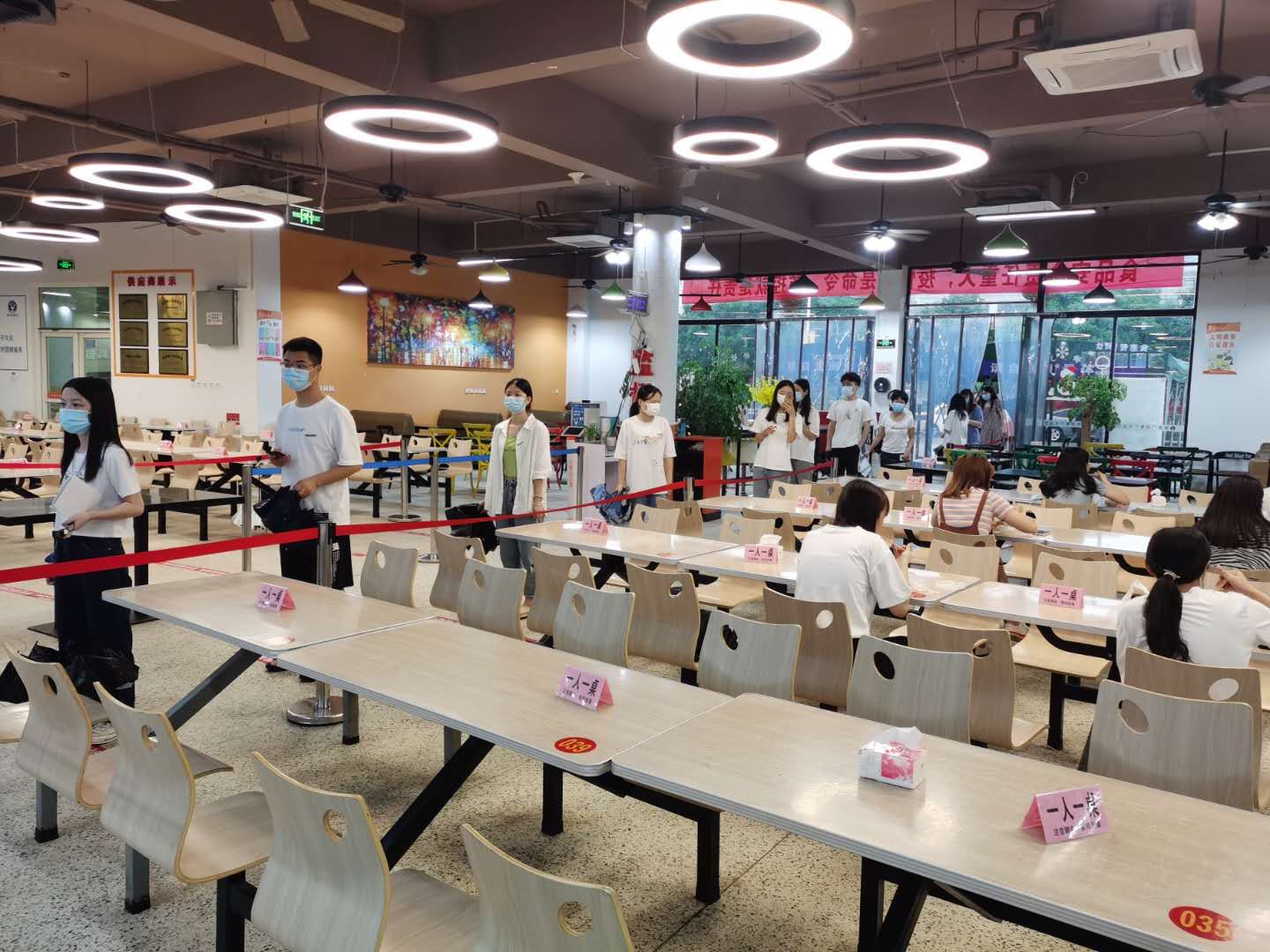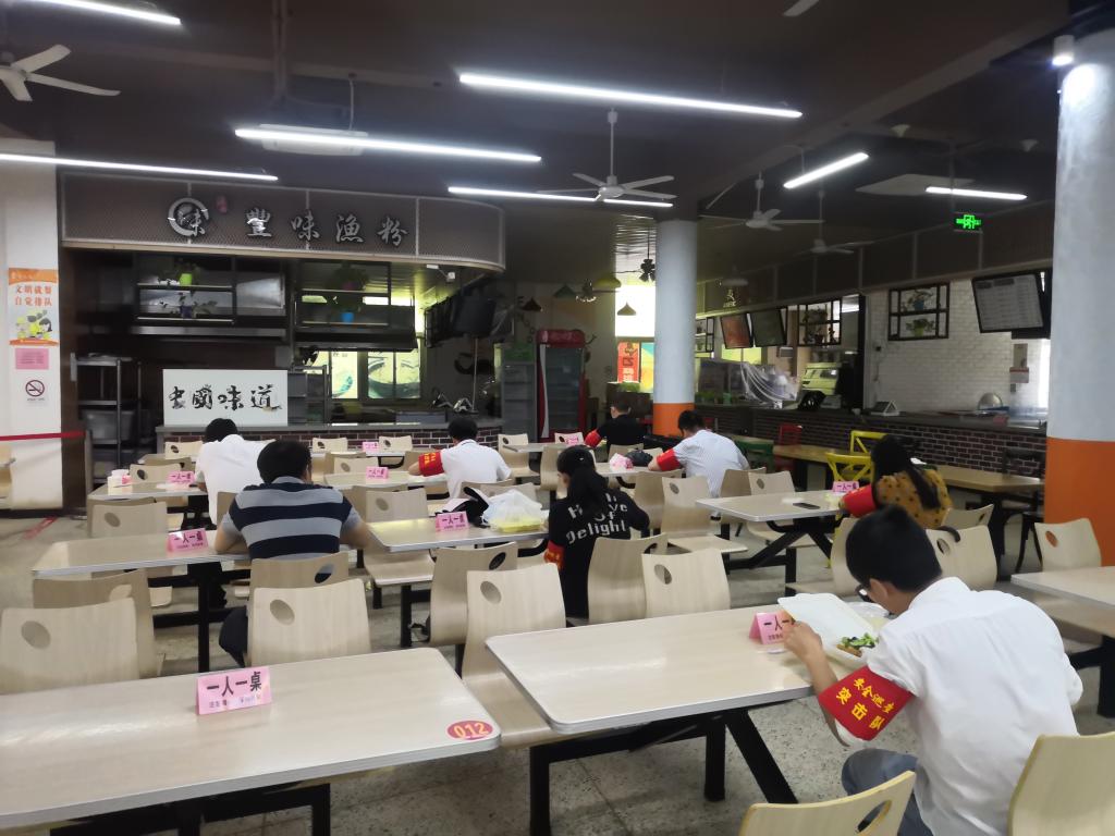 六是保障用餐需求和衛生。對食堂及設施進行全面清潔消毒;嚴把采購渠道關、進貨查驗關、儲存安全關、操作規范關,嚴格落實專人采購、索票索證、進貨查驗、食品留樣制度;落實就餐防控措施,重新劃分取餐區、就餐區,地面張貼引導標識和1米間隔排隊線,實行單進單出,人員分流分區域用餐,餐桌擺放“一人一桌”標語,保持安全距離分散就餐,打造安全放心就餐環境。