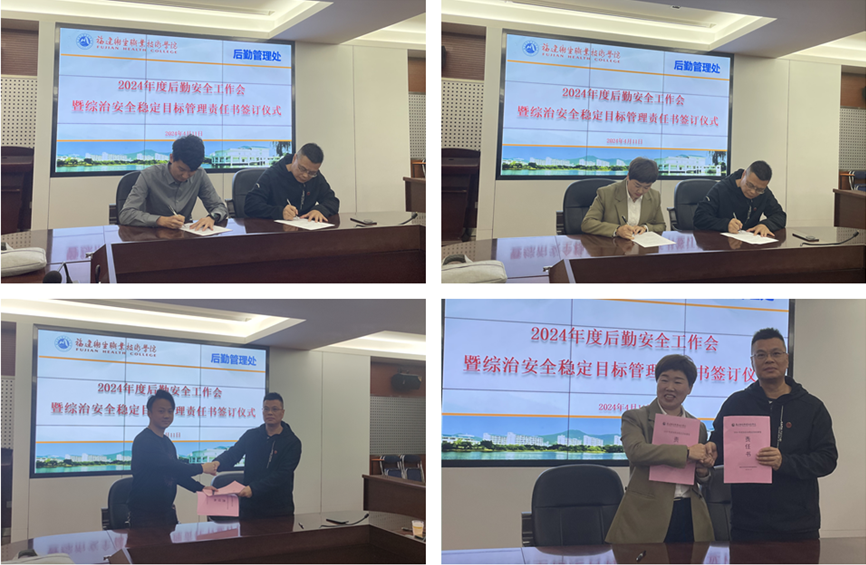 會上,后勤管理處處長艾松軍總結2023年后勤安全工作情況,通報當前食堂經營、修繕施工、校舍管理等安全生產形勢,動員部署2024年后勤安全工作任務。他要求,第三方服務單位要根據自身實際將綜治安全工作責任細化分解到班組和員工個人,做到層層有壓力、人人有指標,形成橫向到邊、縱向到底、責任到人的安全管理體系。隨后,他代表學校分別與第三方服務單位簽訂安全責任書。